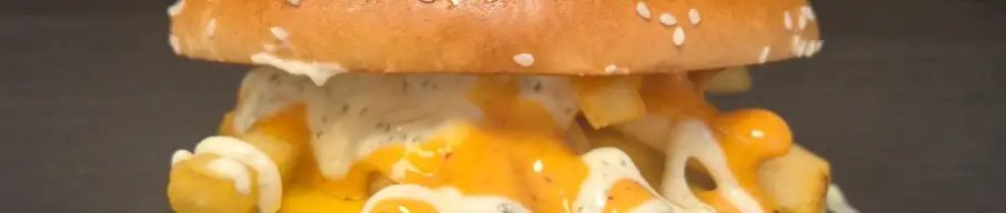 100% rundvlees met kaas, ijsbergsla, knoflook- & srirachasaus, afgetopt met knapperige friet op een sesam bun.